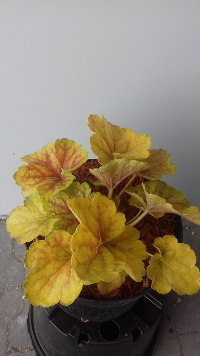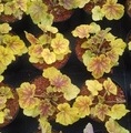 Liście półzimozielone, sercowate, zwykle z 5 klapami o nieco pofalowanym brzegu, w centrum nieregularnie czerwone lub pomarańczowe, na brzegu jaskrawozielone lub żółtozielone.